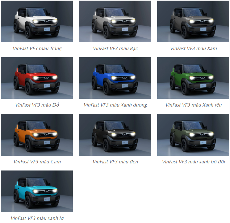 Mặc dù VinFast chưa công bố các màu sắc chính thức cho VinFast VF3 nhưng bằng phần mềm đồ họa người dùng đã đưa ra phối màu với các màu phổ thông phù hợp với sở thích của người Việt Nam như: