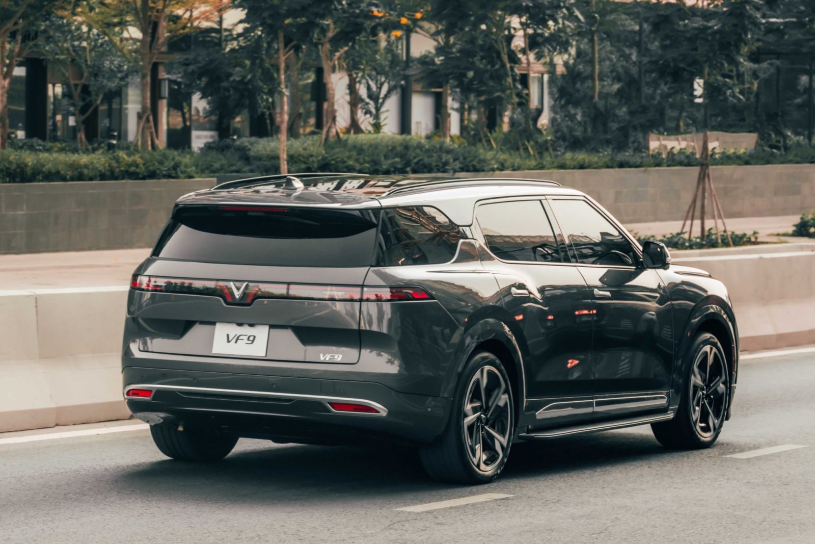 Phần đuôi xe của VinFast VF 9 vẫn với tạo hình chữ “V” quen thuộc. Tuy nhiên, dải LED sẽ được làm dày bản hơn để phù hợp với ngoại hình đồ sộ của dòng xe SUV điện VinFast VF 9. Ngoài ra còn có phần cánh gió thể thao với kích thước lớn ở phía trên phần đuôi xe, giúp cải thiện tính khí động học.